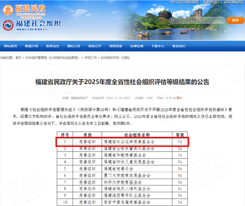 时间: 2025-12-1912月16日,福建省民政厅正式发布《关于2025年度全省性社会组织评估等级结果的公告》,兴业证券慈善基金会再次凭借高标准规范化建设和突出的公益成效蝉联“最高等级”5A级,位居全省111家参评社会组织的前列,同时在国内证券公司发起设立的慈善基金会中,继续保持唯一兼具5A级和FTI中基透明指数满分的双认证资质。