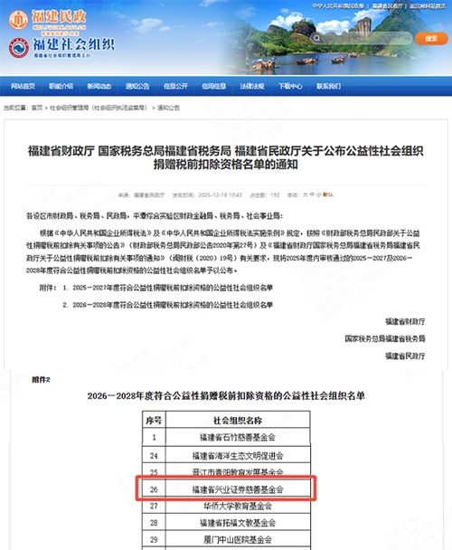 - 福建省兴业证券慈善基金会获得2026-2028年公益性捐赠税前扣除资格(2025-12-19 15:09:57.0)